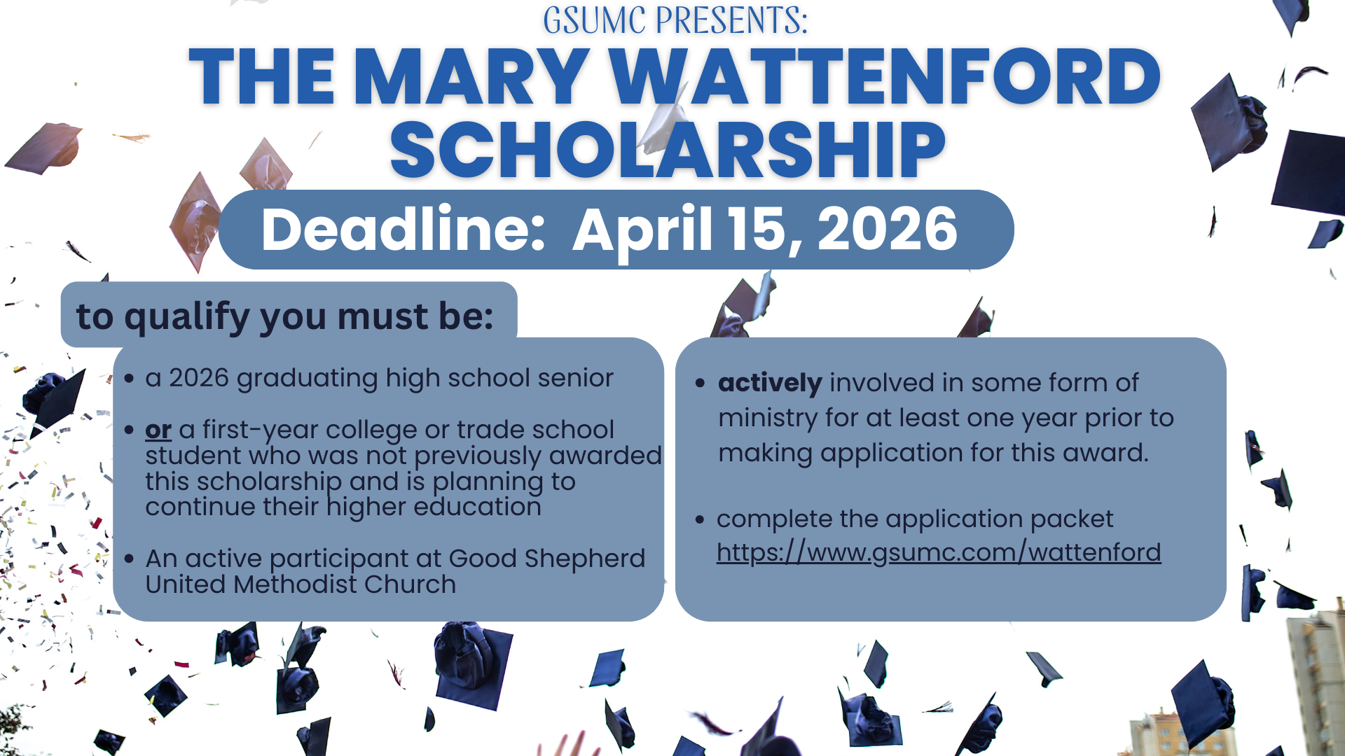 The Mary Wattenford Scholarship was established in 2003 as the Good Shepherd Continuing Education Scholarship. It was established as a service-based scholarship to award the youth of Good Shepherd for their acts of service to the church, community, and most of all to God. Scholarships are awarded to high school seniors who plan to go on to college or some other form of higher education. First-year college students who were not previously awarded this scholarship and are planning to continue their higher education are also eligible to apply. The scholarship fund was named to honor Mary Wattenford, a dear member of Good Shepherd Church who passed away in July 2004. Applicants are judged on their responses to the questions asked below, their letters of recommendation, and their interviews with the Scholarship Selection Committee. The scholarship committee is looking for persons with sound Christian character who practice discipleship in daily life and are able to articulate their faith to others.